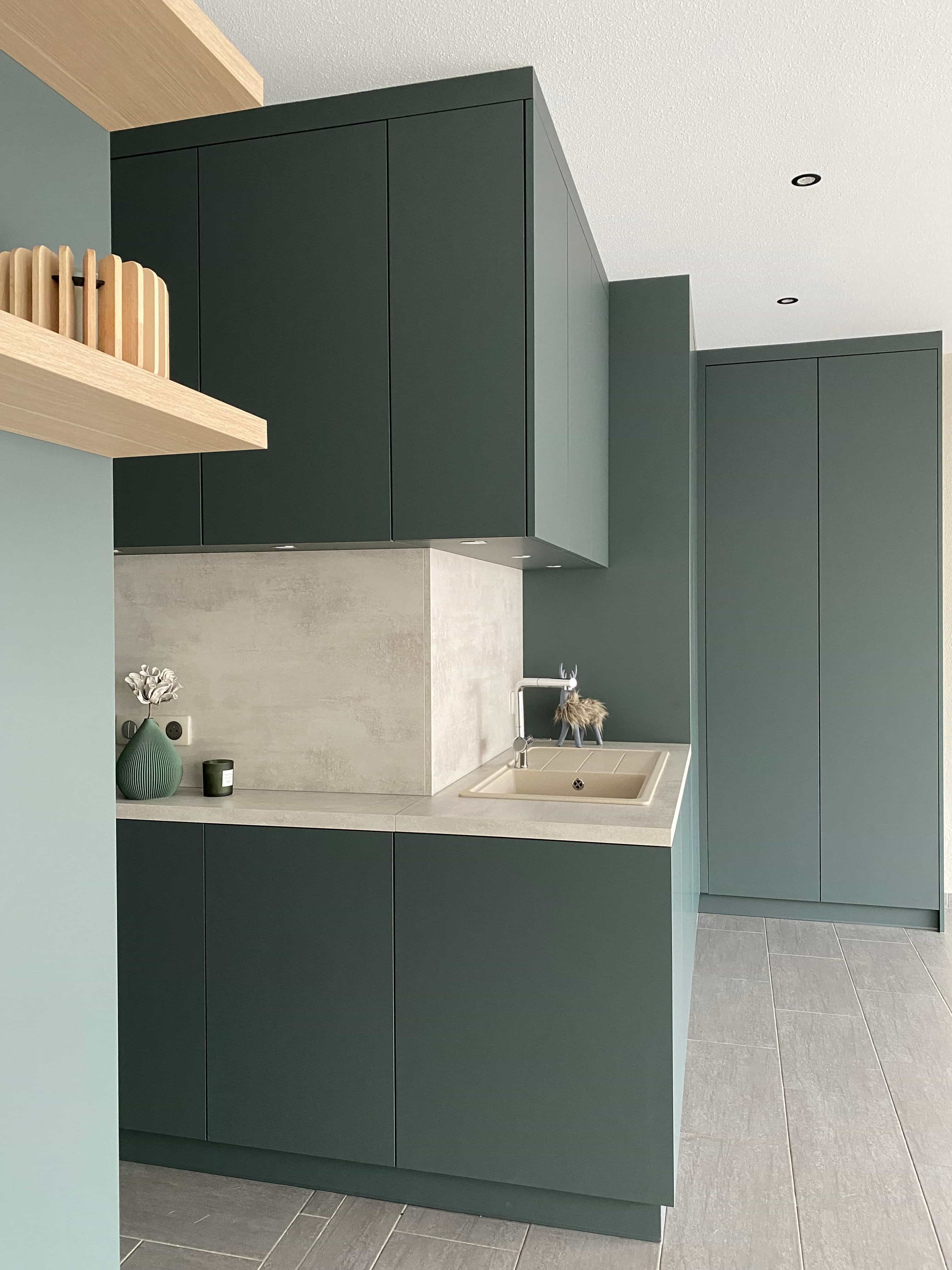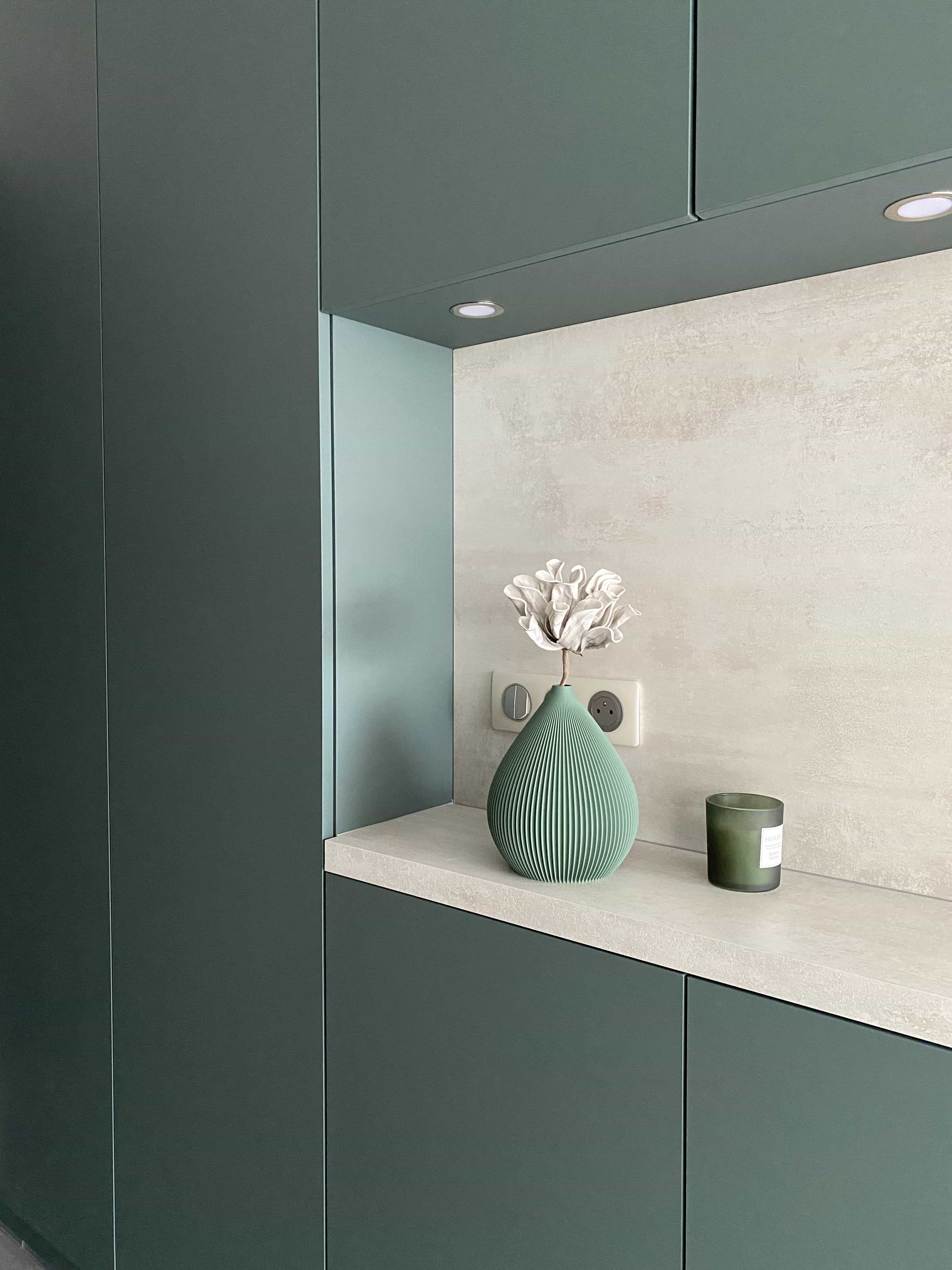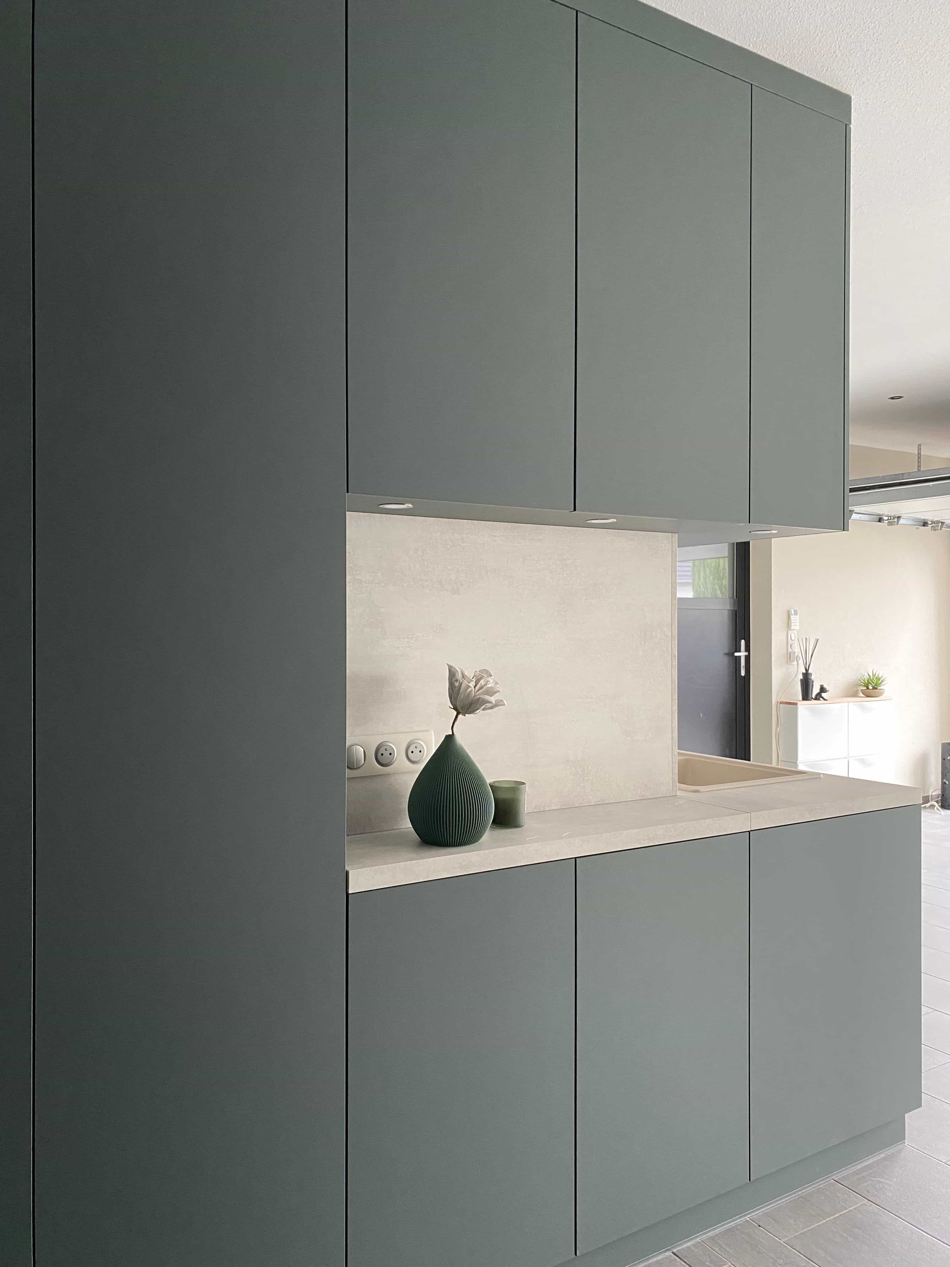 Ce projet d’agencement transforme le garage en un espace fonctionnel, épuré et parfaitement intégré à l’architecture de la maison. Pensé comme une véritable pièce à part entière, le lieu combine rangements sur mesure, zone technique et point d’eau, dans une esthétique sobre et contemporaine. Les volumes sont entièrement habillés de façades pleine hauteur, sans poignée, afin de préserver une lecture architecturale fluide et minimaliste. Le choix d’un vert profond et mat confère au garage une identité élégante et apaisante, loin des codes utilitaires traditionnels. Ce projet illustre notre approche : concevoir des espaces techniques avec le même niveau d’exigence esthétique que les pièces de vie, en alliant fonctionnalité, sur-mesure et cohérence architecturale.
