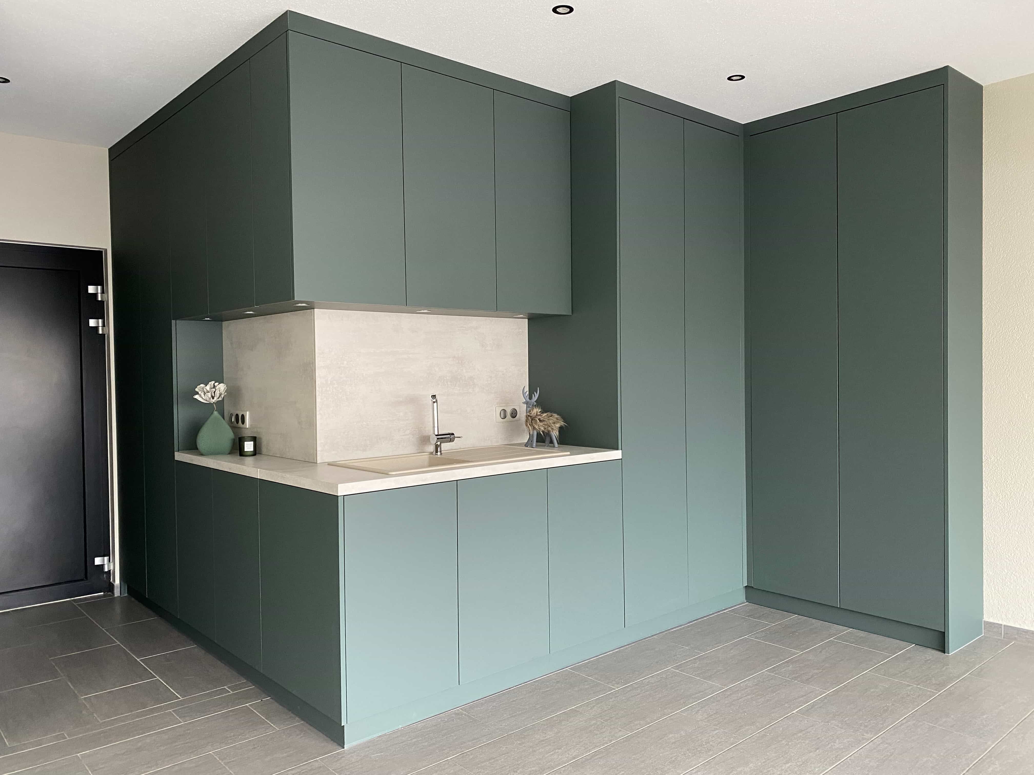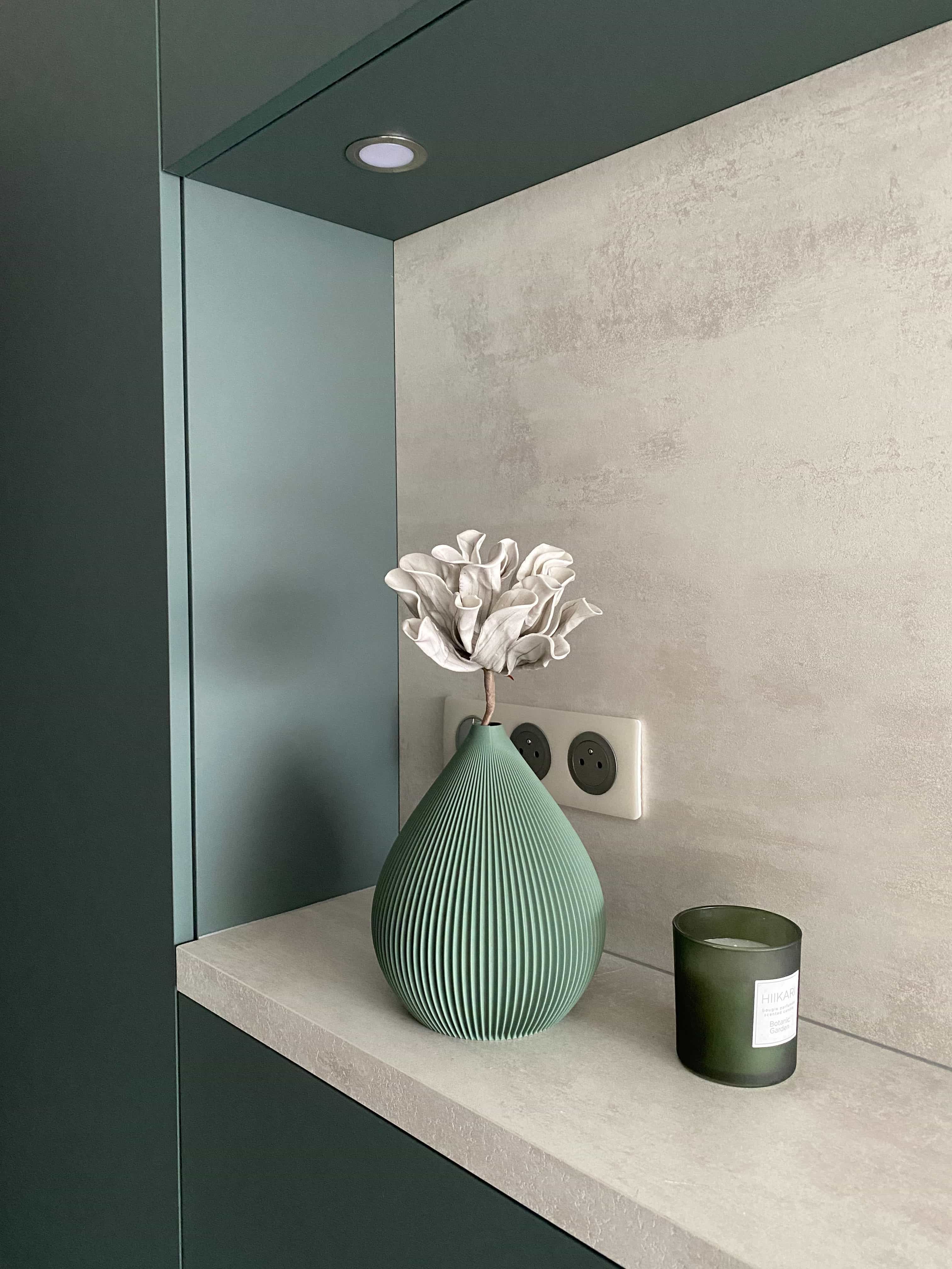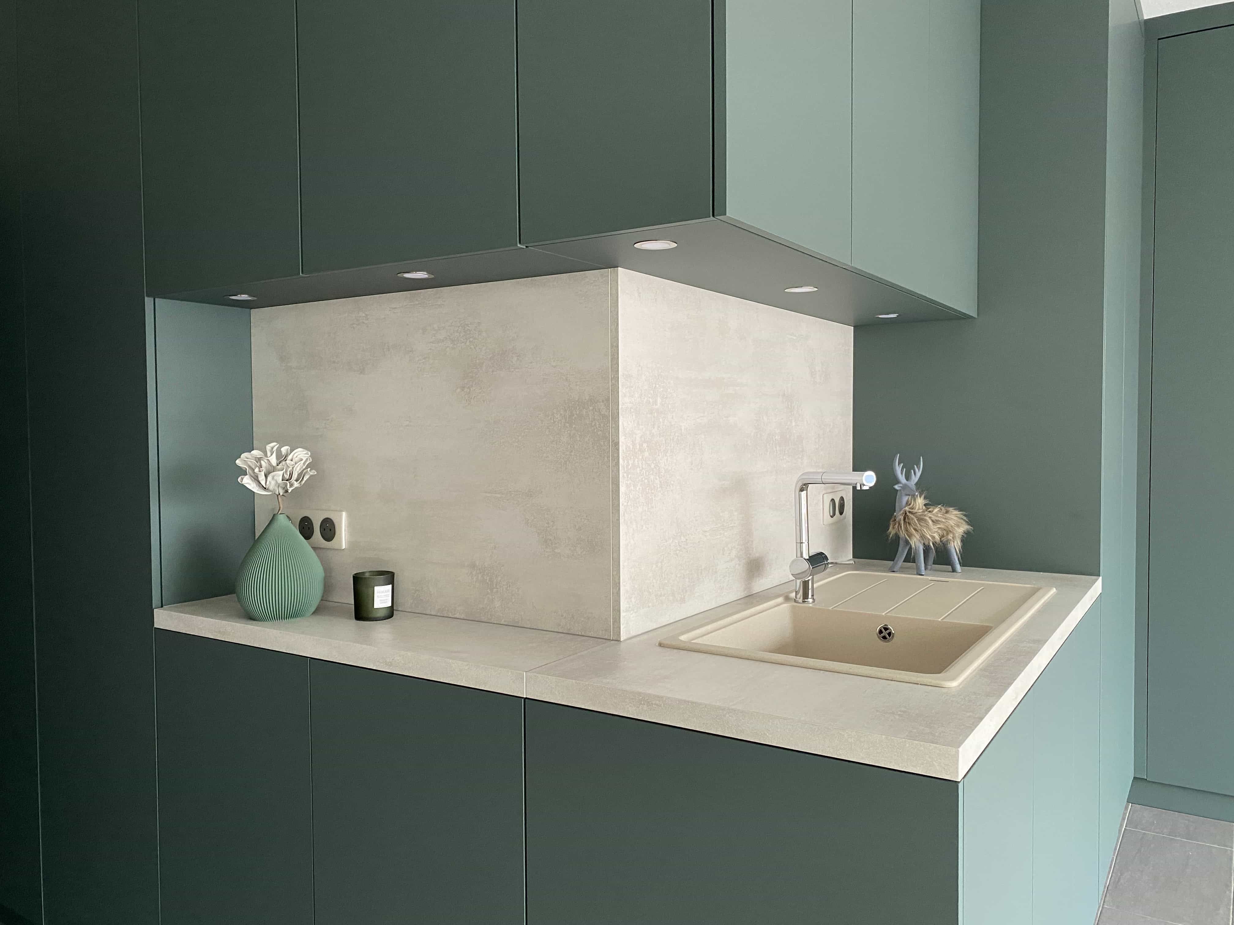 Ce projet d’agencement transforme le garage en un espace fonctionnel, épuré et parfaitement intégré à l’architecture de la maison. Pensé comme une véritable pièce à part entière, le lieu combine rangements sur mesure, zone technique et point d’eau, dans une esthétique sobre et contemporaine. Les volumes sont entièrement habillés de façades pleine hauteur, sans poignée, afin de préserver une lecture architecturale fluide et minimaliste. Le choix d’un vert profond et mat confère au garage une identité élégante et apaisante, loin des codes utilitaires traditionnels. Ce projet illustre notre approche : concevoir des espaces techniques avec le même niveau d’exigence esthétique que les pièces de vie, en alliant fonctionnalité, sur-mesure et cohérence architecturale.